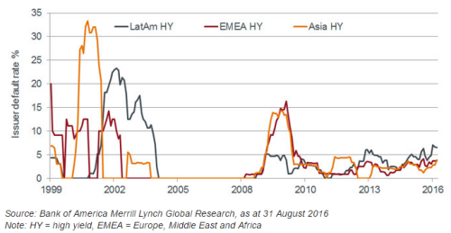 EM default rates have risen in 2016 but the increase has taken place almost exclusively in Latin America. Trailing 12-month defaults are currently running at 3.5% globally, but at 5.5% in Latin America. We expect this trend to continue, with Latin American, especially Brazilian, corporates dominated by the commodity and energy sectors. Asian defaults are also expected to stay low as Chinese companies focus on the domestic market for their financing needs.