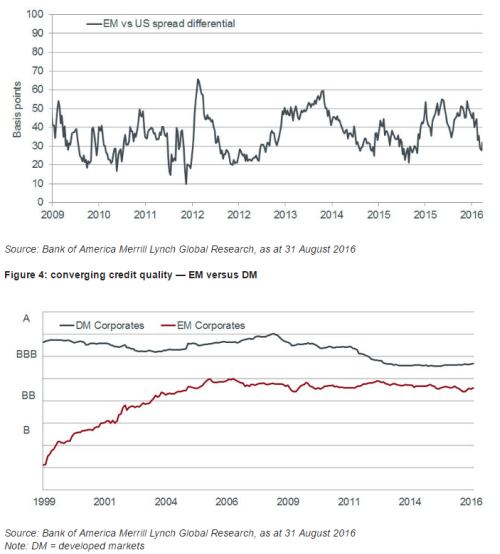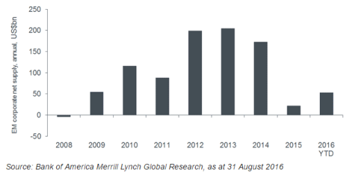At a time of reduced debt issuance by EM corporates, inflows into the asset class continue to be extremely strong, driven by low or negative global government bond yields creating a strong search for yield among investors. Importantly EM corporates have seen large flows from non-EM investors, which make the asset class susceptible to large outflows of money if market sentiment turns sour. However, in the near term, accommodative central bank policy from the European, UK and Japanese central banks is likely to continue to sustain the global hunt for yield and benefit the EM market.