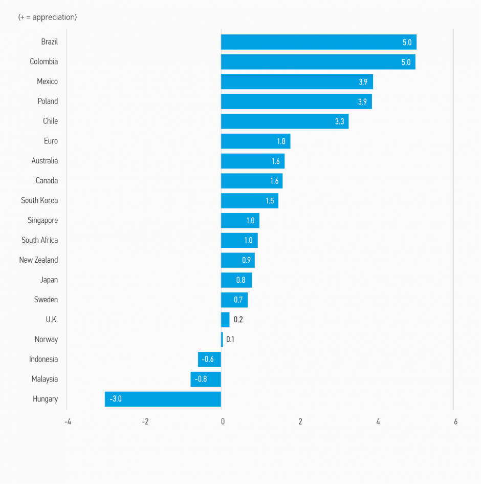 Note: Positive change means appreciation of the currency against the USD. Source: Bloomberg. Data as of May 31, 2022.