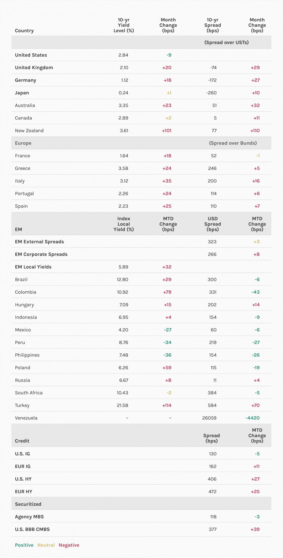 Price action in the rest of the world’s bond markets was not so benign. Yields in Europe rose significantly with German 10-year yields up 18 bps. It was quite noticeable that in countries where monetary policy hawkishness weakened to some degree, bond markets did OK; but in those countries where central bank hawkishness was maintained or intensified, bond yields continued to rise over the month.