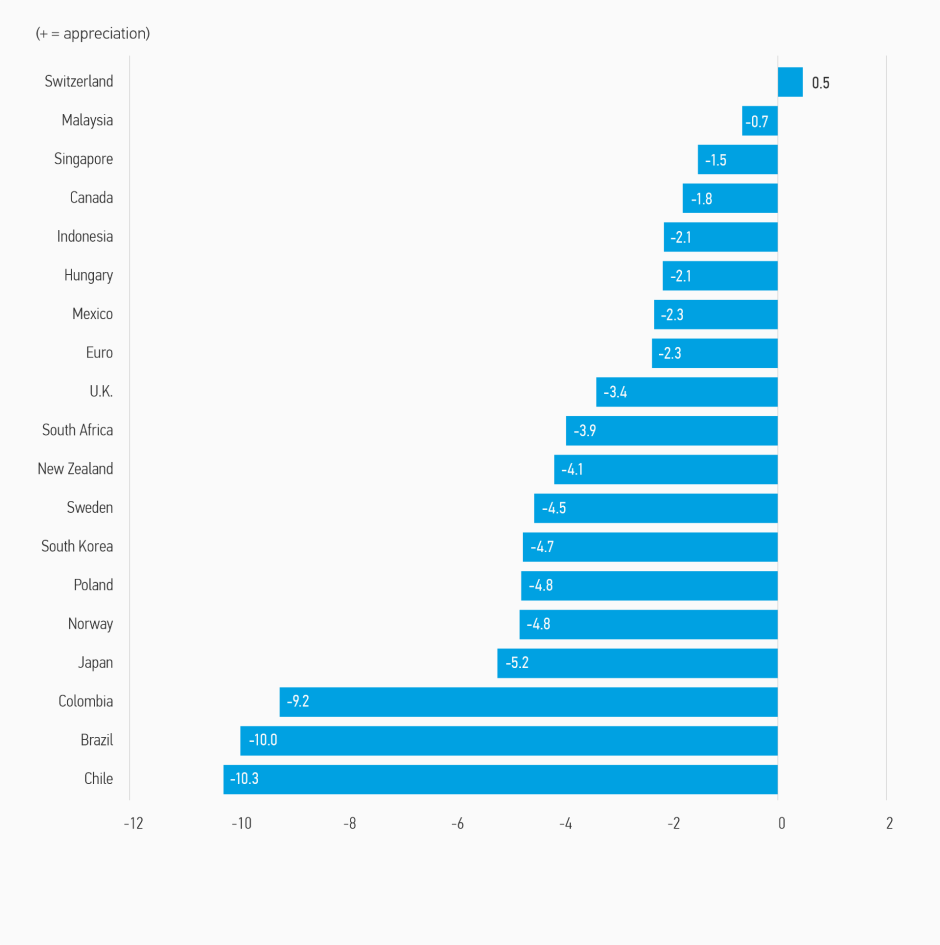 Note: Positive change means appreciation of the currency against the USD. Source: Bloomberg. Data as of June 30, 2022.