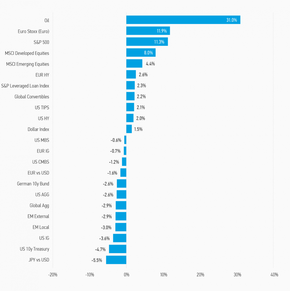 Contrary to the underperformance of European peripheral bond markets, Euro and U.S. credit markets, investment grade, and high yield, fared well once again, with credit spreads tightening over the month. Outperformance of high yield was notable, with spreads tightening by double digit basis points (bps). Outperformance was supported by the search for yield, growing economic optimism, higher equities and, most importantly, falling real yields. Notably, spread compression between higher- and lower-quality rating buckets dissipated, despite all the good news, with CCC bonds only marginally outperforming BB- and B-rated sectors.