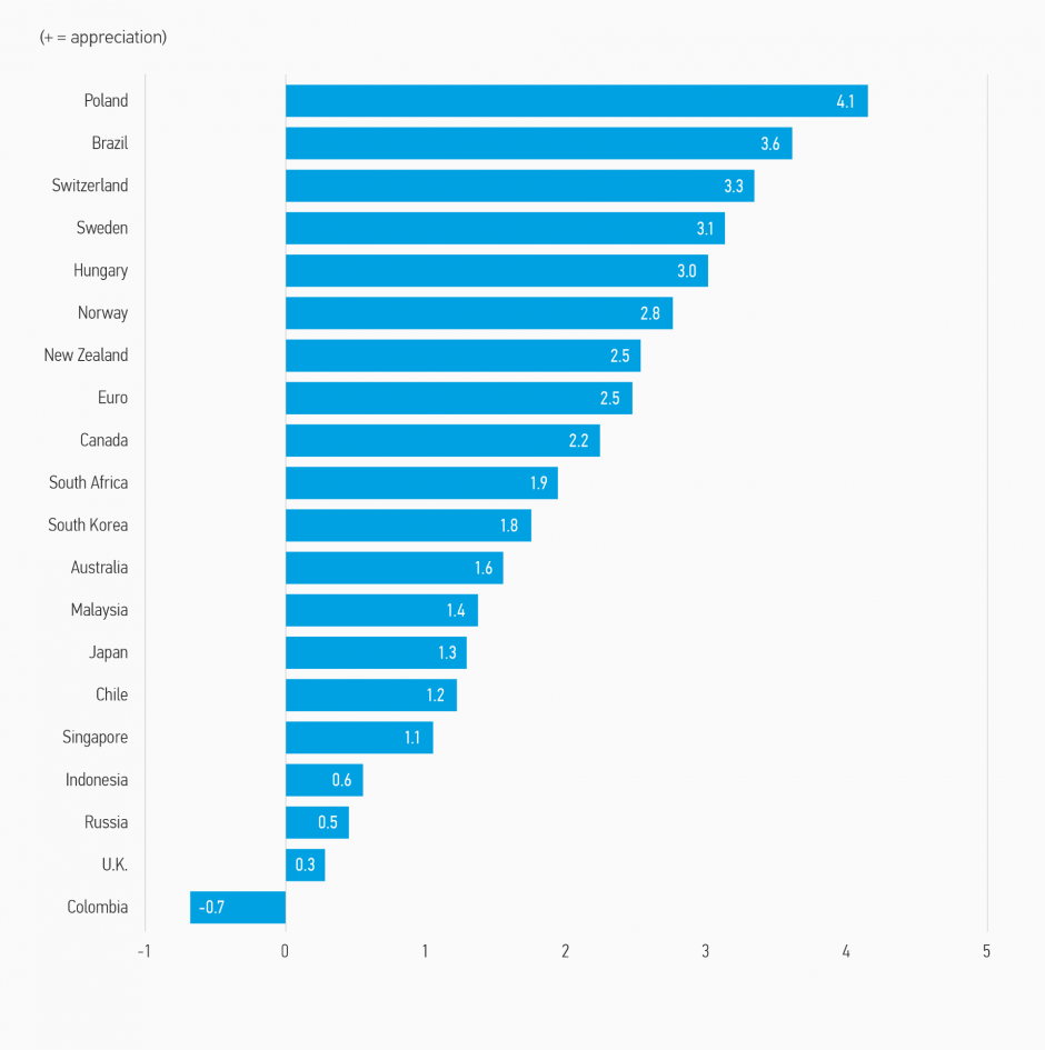 Note: Positive change means appreciation of the currency against the USD. Source: Bloomberg. Data as of April 30, 2021.