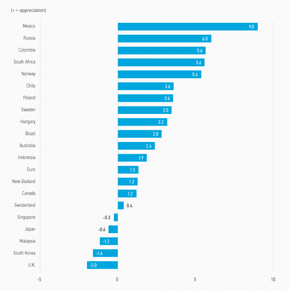 The stabilization and rebound in April continued into May as risk appetites continued to improve. Some developed economies began to reopen as infection rates declined and promising initial results from COVID-19 vaccine trials were released, resulting in increased confidence in the global recovery. The U.S. dollar weakened4 as demand for safe-haven assets declined. Market-based inflation expectations increased for the second month in a row, consistent with the more positive risk sentiment and rising commodity prices. While the U.S. Treasury 10-year yield was close to unchanged over the month, euro sovereign spreads tightened significantly in response to proposals for an EU recovery fund, leading to lower yields on most government debt.5 Developed market central banks remained committed to doing whatever it takes to promote stability and recovery in the global financial markets.