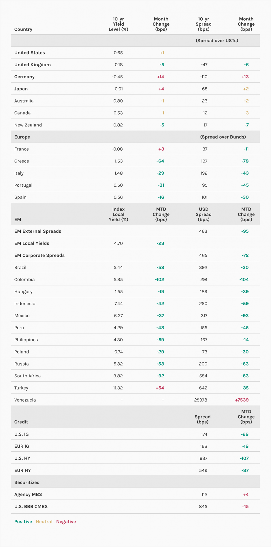 The rebound of risky assets and the muted response of government bond yields shows the combined power of better economic data, easing of lockdown restrictions, improved confidence, and, most importantly, generally better news on the pandemic front. There is no doubt that markets have moved quickly, so quickly that many market participants appear to be suffering from whiplash and a bit of bewilderment as to how something so bad could turn around so quickly. There are risks ahead, however. The U.S. presidential election, combined with the large-scale social protests (and their ramifications), have injected added uncertainty into an already complicated world. To make matters even more convoluted, U.S./China political issues have been resurrected. So while markets may consolidate while they catch their breath and re-evaluate the future and relative risks, we believe corrections should be shallow. The recent risk-on moves are likely to continue.