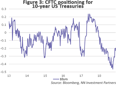 We closed our underweight in US Treasuries in mid-October, when the 10-year yield was at 3.15%. A key reason was the extreme underweight position of investors in US 10-year Treasuries. Since then, these positions have significantly normalised, which has coincided with a sizeable 10-year yield correction. We view this as reason to re-enter an underweight position in US 10-year bonds. Not only has the investor positioning adjusted, but other supportive factors include a decline in Fed rate pricing (to below our own forecasts), a decline in the term premium and a decline in market pricing of long-term inflation expectations.