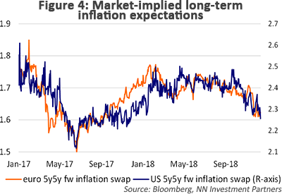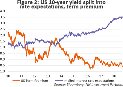 The drop in market-implied Fed rate expectations reflects the market’s worry that we are approaching the end of the cycle. It indicates a cyclical development rather than the ultimate neutral rate. Separating out the US 10-year yield into interest rate expectations and the term premium shows that the market’s opinion of the neutral rate has not changed much, whereas the term premium has dropped significantly. Figure 2 confirms that the rise of the US 10-year yield over the past years has been driven by long-term interest rate expectations rather than the term premium. The latter remains very low.