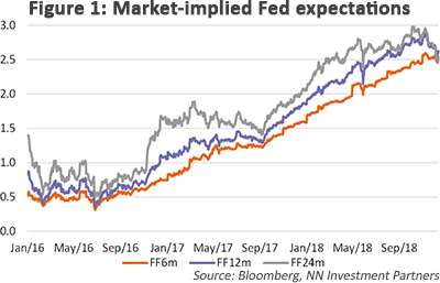 As US government bond yields have declined, we have seen both a drop in the term premium and a decline in near-term Fed rate expectations. There has been a particular decline in further-out Fed expectations in futures contracts, as seen in Figure 1. The market currently assumes one further hike by the end of 2019. For 2020, the expected Fed rate is marginally lower than the current level. These market-implied Fed expectations are well below our own forecast, which is for one more hike this year and three next year. Since the peak this summer, market-implied expectations for the Fed rate at the end of 2019 and 2020 have dropped by 37 bps and 44 bps, respectively.
