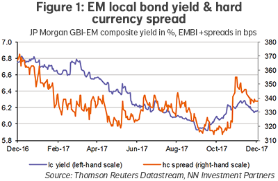 After widening between September and November, EMD rates and spreads have narrowed again in the past weeks. A third to half of the widening has been recovered (see Figure 1). It is not clear what has changed or what concretely explains the more constructive market sentiment. EM endogenous factors have remained supportive throughout the year, even from September through November. They never were the cause of the correction. The only credible explanation for the rising EM yields from mid-September is Fed pricing. Two additional Fed rate hikes have been priced, which has made the EM carry trade look less attractive and caused some modest profit-taking in both local-currency and hard-currency emerging debt.