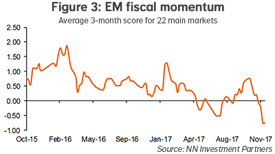 As said earlier, the endogenous EM factors have been positive, already for a while. EM growth momentum remains positive, while external imbalances have narrowed substantially. Inflation continues to be modest, rising a bit from the 2.6% bottom of earlier this year, but unlikely to exceed 4% in the coming quarters. And thanks to the better growth performance and reforms in some countries, fiscal accounts have stopped deteriorating and have even started to improve on an aggregate level. In our EM fiscal momentum indicator (see Figure 3), a negative score means that, on balance, for the 22 main emerging economies, the fiscal deficit is narrowing.
