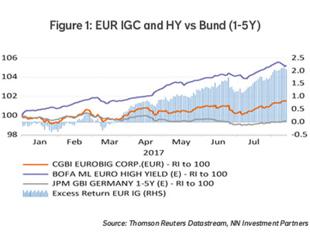 So far this year, EUR credits have considerably outperformed their USD counterparts. This holds for both investment grade as well as high yield. EUR credit spreads tightened considerably more than USD. Bund yields have been on the rise since the start of the year while the opposite was the case in the US. Excess returns of EUR credit therefore have been solid so far this year (see Figure 1).