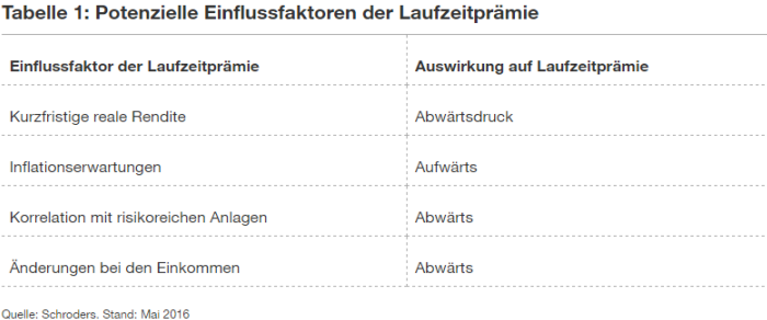 Das Wirtschaftswachstum war nach der globalen Finanzkrise sehr schwach und die Realeinkommen konnten mit dem Anstieg des Preisniveaus nicht Schritt halten. Dies war ein Anreiz für die Verbraucher, zu sparen und ihre künftigen Konsumausgaben aufzuschieben. Deshalb gab es ein Überangebot an Ersparnissen, dem die Investitionsausgaben nicht folgen konnten. Aufgrund dieses Überangebots an globalem Kapital, das durch die lockere Geldpolitik noch erweitert wurde, sind die Realzinsen unter Druck geraten.Die Laufzeitprämie entspricht der zusätzlichen Rendite, die ein Geldgeber verlangt, weil er eine langfristige Anleihe hält, anstatt in kurzfristige Anleihen zu investieren. Die Laufzeitprämie selbst ist nicht direkt beobachtbar, sie kann jedoch anhand der Fundamentaldaten oder der Terminkurve eingegrenzt werden. Die Laufzeitprämie kann sehr gering oder sogar negativ sein, wenn Anleihen eine gute Absicherung gegenüber den Risiken der Anleger bieten – z. B. Inflation, Änderungen bei den Erträgen oder der Renditen anderer Anlagen im Portfolio des Anlegers. Aus Tabelle 1 gehen die potenziellen Einflussfaktoren der Laufzeitprämie hervor, die von Ben Bernanke, dem Ex-Chef der US-Notenbank, im Jahr 2013 in einer Rede hervorgehoben wurden. Ergänzt wird diese Tabelle mit unseren Einschätzungen hinsichtlich dessen, wie sich die einzelnen Faktoren tatsächlich auf die Prämie auswirken: