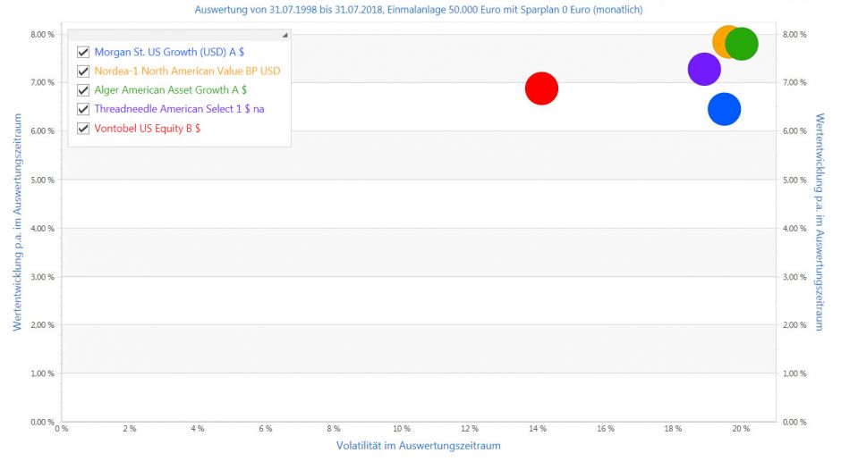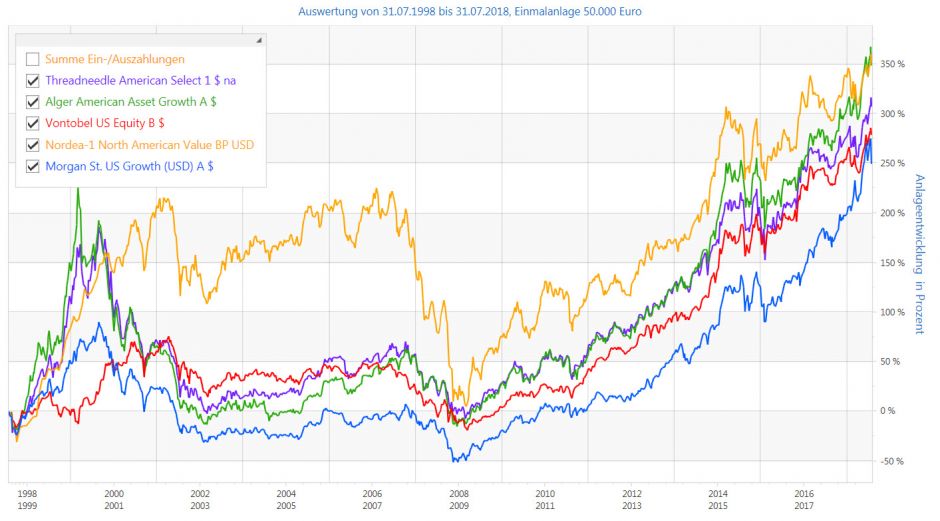 Der S&P 500 hat jüngst einen neuen Rekord aufgestellt. Seit 2009 geht es für den US-Index ohne nennenswerte Unterbrechungen „straight uphill“. Wer rechtzeitig eingestiegen ist, kann sich über satte Erträge freuen. Erfahrene Anleger wissen, dass nach jeder Hochphase ein Tief lauert - ideal für den Einstieg. Wir schauen daher auf die langfristige Entwicklung von US-Aktienfonds. Unsere Analyse führen wir mit der Beratersoftware „FVBS professional“ durch. Das Testszenario geht von einer Einmalanlage von 50.000 Euro aus, der Anlagezeitraum umfasst die vergangenen 20 Jahre. Die Peergroup filtern wir nach thesaurierender Ertragsverwendung, Indexfonds werden nicht berücksichtigt. Unter diesen Bedingungen schmilzt die größte FVBS-Peer group von knapp 1100 Fonds um den Faktor 50 auf 20 Fonds zusammen, anteilsklassenbereinigt bleiben nur siebzehn Fonds auf dem Tableau. Stichtag der Auswertung ist der 31. Juli 2018.