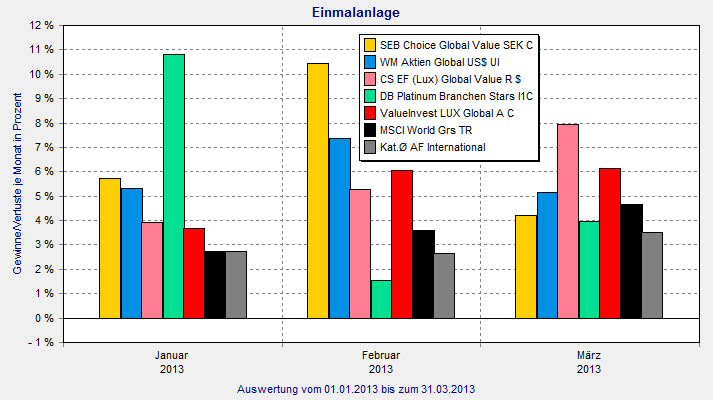 Mit Platz drei schaffte der CS (Lux) Global Value R (ISIN: LU0268334777) von Credit Suisse den Sprung aufs Treppchen. Fondsmanager Georg Trachsel kann die enttäuschende Performance von nur 1,59 Prozent aus dem letzten Jahr korrigieren und kommt auf 18,08 Prozent im ersten Quartal 2013. In den vergangenen drei Jahren erreichte der fast 300 Millionen Euro große Fonds eine Wertsteigerung von 25,02 Prozent, bei einer Volatilität von 15,36 Prozent. Die Sharpe Ratio liegt bei 0,31.