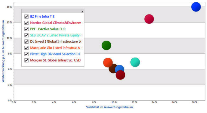Alle Top-Sieben-Themenfonds schlagen das Sparbuch um Längen. Besser: um Welten. Den besten Fondssparplan bietet der BZ Fine Funds - BZ Fine Infra T (ISIN: LU0574145370). Aufgelegt hat ihn die die schweizer BZ Bank über die luxemburgische Kapitalverwaltungsgesellschaft IPConcept. In den fünf Jahren liegt er mit 22.966 Euro gut 50 % über dem Ertrag eines Sparbuchs. Er investiert vorwiegend in Unternehmen aus dem Bereich Infrastruktur und Versorgung. Über die genauen Positionen sind keine Angaben bekannt. Mit einem kumulierten Plus von 126,3 % performt er doppelt so stark wie der Durchschnittsfonds der Kategorie (64,4 %). Das hat seinen Preis. FVBS professional listet ihn auf einer Risikoskala von 0-7 mit sechs. Dennoch liegt sein maximaler Drawdown noch im Soll. Seine Vola von fast 18 % entspricht gut dem Doppelten des Mittelwerts der Kategorie (9,5 %) – damit ist der Fonds Spitzenreiter der Peegroup. Dennoch kommt er mit einer Sharpe Ratio von nur knapp 1.00 schlechter weg als der Duschschnitt (1,11).