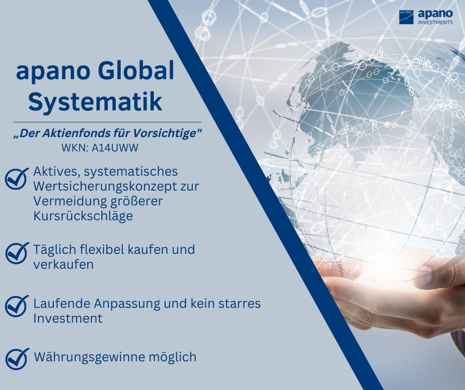 Mit dem apano Global Systematik ist schon im Jahr 2015 der „Aktienfonds für Vorsichtige“ entstanden, der die Chancen der Weltaktien nutzt und gleichzeitig über ein Sicherheitsnetz verfügt. In bislang allen schwierigen Phasen der Börsen hat das Konzept überzeugt.