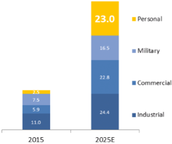 Der Begriff «Serviceroboter» bezeichnet Roboter, die nicht in Fabriken eingesetzt werden, sondern etwa im Haushalt, Restaurants oder Hotels dem Menschen nützliche Dienstleistungen erbringen. Prognosen zufolge dürfte der globale Markt für Serviceroboter von USD 2,5 Mia. (jährliche Erträge) im Jahr 2015 auf fast das Zehnfache, nämlich eindrucksvolle USD 23 Mia., im Jahr 2025 anwachsen. Bis dahin dürften Serviceroboter über einen Viertel des Robotertechnikmarktes ausmachen (Abbildung 1). Diese Schätzungen sind eindrücklich, aber die Stückzahl ist ebenso imposant: Die International Federation of Robotics schätzt, dass zwischen 2016 und 2019 insgesamt 42 Millionen Serviceroboter Abnehmer finden werden, die dann privat und im Haushalt eingesetzt werden. Haushaltsroboter (zirka 31 Millionen Stück) dürften dabei an erster Stelle stehen. Zu 96 % dürften sie zum Staubsaugen und Bodenputzen benutzt werden. Die restlichen rund 11 Millionen Serviceroboter werden sich aus jeglicher Art von Unterhaltungsrobotern oder Kinderspielzeug zusammensetzen.(2) (2 Quelle: International Federation of Robotics, «Publication of World Robotics 2016 – Service Robots», Oktober 2016 )