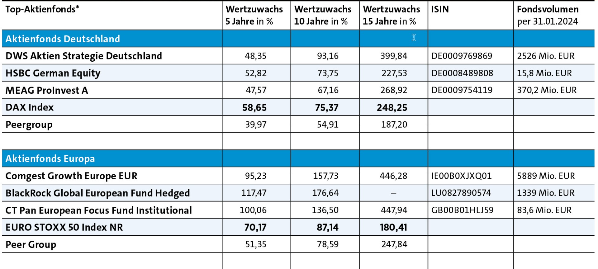 Aktuell besteht das Portfolio zu 65 Prozent aus Large Caps, zu 20 Prozent aus Mid Caps und zu elf Prozent aus Small Caps. Die größten Positionen sind SAP, Allianz, Infineon, Deutsche Telekom und Deutsche Post, die wichtigsten Branchen sind IT, Finanzen und Industrie. Damit erzielte der DWS-Fonds in den vergangenen fünf Jahren eine durchschnittliche Jahresrendite von 8,2 Prozent.