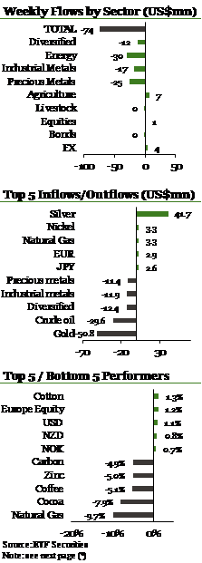 Gold-ETPs erlitten in der dritten Woche in Folge Abflüsse während Silber-ETPs hohe Zuflüsse zu verzeichnen hatten. Zu Abflüssen kam es außerdem vorwiegend bei Industriemetall-ETPs, die angeführt von breit aufgestellten Rohstoffkorb-ETPs 130,4 Mio. USD verloren.