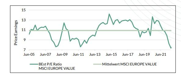Im MSCI Europe Value ist bei theoretischer Annahme einer Rückkehr des KGV zu seinem historischen Durchschnitt von knapp 11 in der aktuellen Bewertung bereits ein Rückgang des Gewinns je Aktie von mehr als 30% eingepreist - ein drastisches Szenario, ähnlich dem des Jahres 2020, als die Weltwirtschaft aufgrund der Corona-Krise und genereller Lockdowns vollständig zum Stillstand gekommen war.