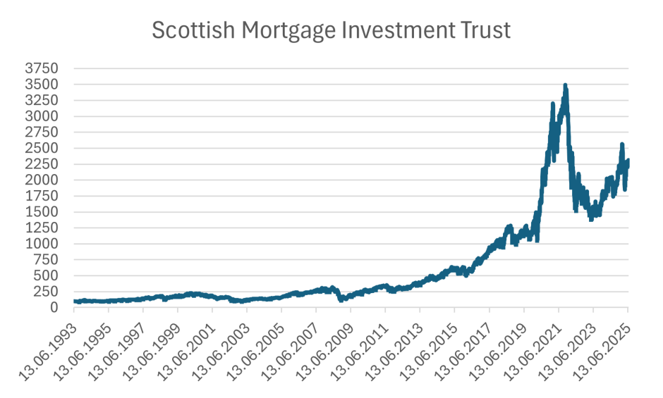 Der Scottish Mortgage Investment Trust blickt auf eine über 100-jährige Geschichte zurück – er wurde bereits 1909 aufgelegt. Der Fonds überzeugt Trust langfristig mit einer überzeugenden Wertentwicklung. In den vergangenen zehn Jahren erzielte der Scottish Mortgage eine Gesamtrendite von 228 Prozent. Zum Vergleich: Der FTSE All-World Index, die Benchmark des Trusts, legte im selben Zeitraum um 145 Prozent zu. Über 30 Jahre betrachtet beträgt die Rendite des Trusts 3.213 Prozent, gegenüber 980 Prozent beim Vergleichsindex.