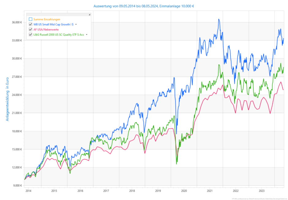 In den vergangenen 10 Jahren hat der Fonds im Schnitt um 12,4 Prozent pro Jahr zugelegt. Damit war er deutlich besser als die Peergroup mit einem jährlichen Gewinn von 9,6 Prozent. Zudem gehört er damit zu den 5 besten US-Nebenwertefonds. Die Volatilität des Fonds betrug auf 10-Jahres-Basis 17,4 Prozent. Auch im laufenden Jahr ist der Fonds mit 6,1 Prozent recht erfolgreich unterwegs. Auf 12-Monats-Basis hat der Fonds um 18,0 Prozent auf Euro-Basis zugelegt. (Quelle für die *Performance Angaben (Tranche-I) auf Euro-Basis FVBS professional; Stand: 30.04.2024)