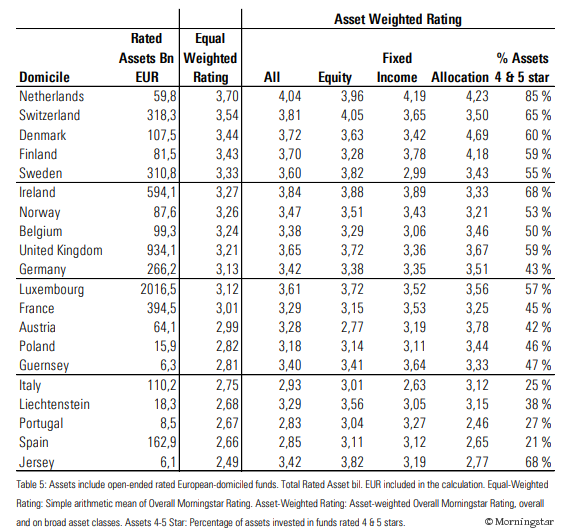 Der Untersuchung zufolge waren die in den Niederlanden aufgelegten Fonds im vergangenen Jahr die besten Fonds in Europa. Auf Platz zwei folgt die Schweiz. Bemerkenswert: In beiden Ländern sind Vertriebsmodelle mit Kickbacks auf dem Rückzug. In den Niederlanden sind sie komplett verboten, in der Schweiz sind sie immer seltener vorzufinden. Der Grund dafür ist wohl, dass sogenannte Retrozessionen im maßgeblichen Bankenvertrieb vom Bundesgericht in den Jahren 2006 und 2012 eingeschränkt wurden.