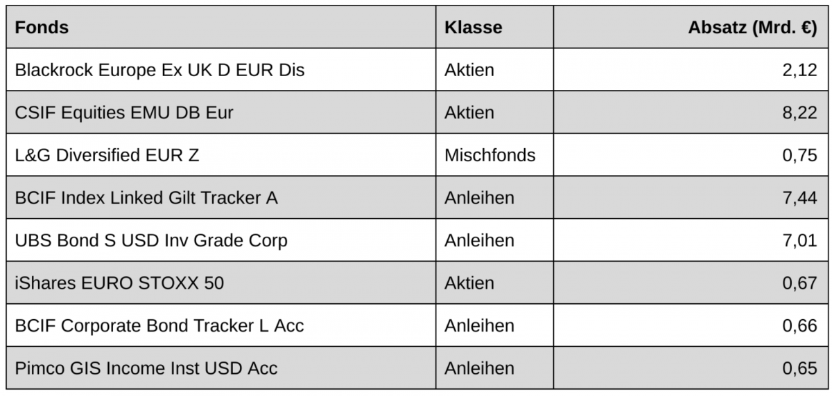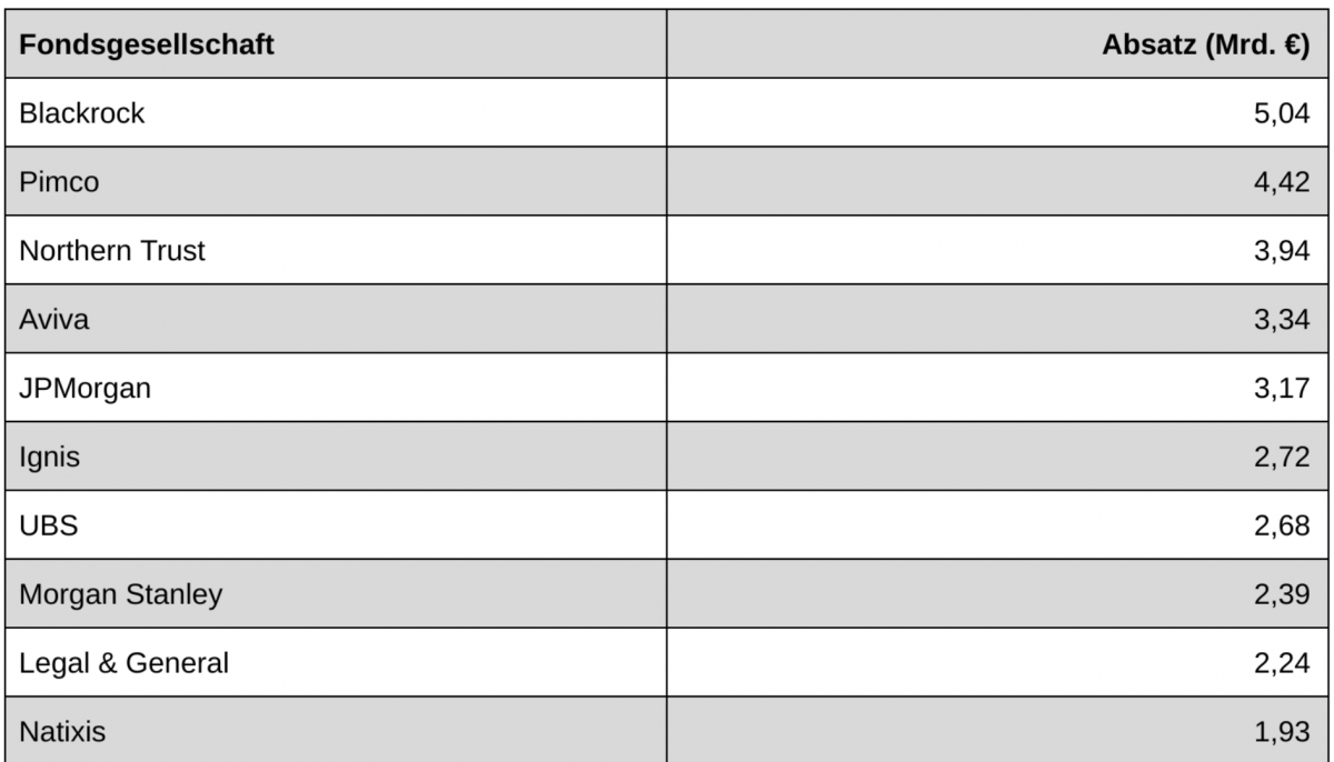 Erwartungsgemäß erzielte Pimco bei den Anleihenfonds das beste Ergebnis (4,3 Mrd. €), während bei den Verkäufern von Aktienfonds der erste Platz an Northern Trust (0,8 Mrd. €) geht. Die Allianz erreichte bei Mischfonds die Spitze (0,9 Mrd. €).