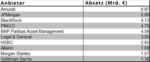 Bei den Aktienfonds hingegen konnte sich BlackRock mit 1,5 Milliarden Euro Verkaufsvolumen vor Vanguard (0,8 Mrd. €) und Schroders (0,5 Mrd. €) platzieren.