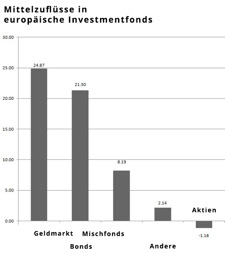 Am besten lief das Geschäft bei den Anbietern von Geldmarktprodukten (+24,9 Mrd. €) wobei hier vor allem die auf Euro notierenden Fonds stark zulegten (+15,2 Mrd. €). Auch die in gehedgte US-Bonds investierenden Fonds konnten sich über einen starken Mittelzufluss in Höhe von 4,9 Milliarden Euro freuen, während andererseits US-High-Yields derzeit nicht in der Gunst der Anleger stehen (-1,4 Mrd. €).