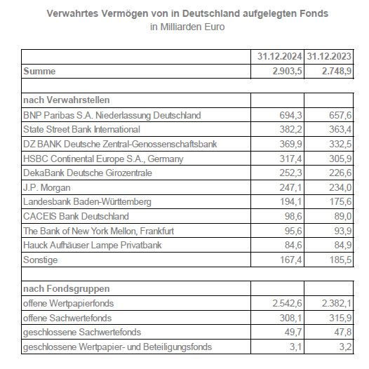 Die Depotbanken verwahrten insgesamt 2.904 Milliarden Euro am 31. Dezember 2024 für in Deutschland aufgelegte Fonds, vermeldet der Branchenverband BVI.