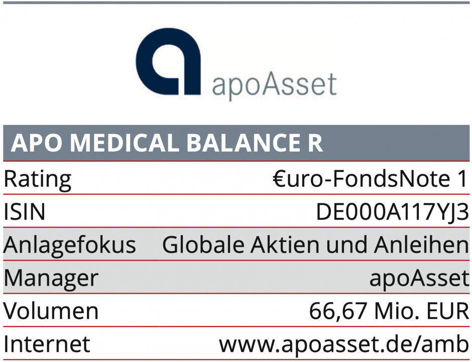 Der apo Medical Balance investiert weltweit, unabhängig von Börsenindizes und Regionen. Durch die Verteilung des Kapitals auf Aktien und Anleihen ist der Mischfonds in Börsenphasen, in denen die Volatilität zunimmt, weniger schwankungsanfällig. Das Fondsmanagement-Team um Kai Brüning und Alexander Chamier achtet darauf, dass im Portfolio ausreichend Titel vertreten sind, die dem Anspruch des Fonds gerecht werden, regelmäßig attraktive Erträge ausschütten zu können. Bei Aktien bevorzugen die Fondsmanager günstig bewertete Wachstumstitel mit solidem Geschäftsmodell. Auf der Rentenseite setzen sie unter Beachtung strengen Risikomanagements auf einen renditestarken Mix aus Anleihen bonitätsstarker Unternehmen und einer Beimischung von High Yields. Diese Strategie ist zuletzt hervorragend aufgegangen.