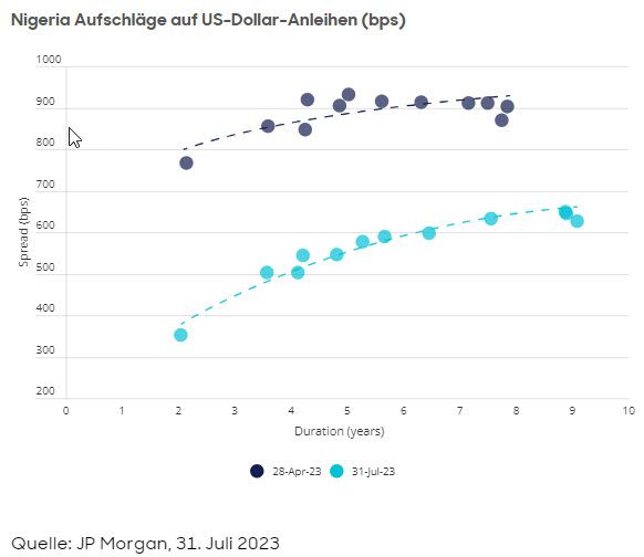 Das Bestreben der neuen Regierung, zwei der wichtigsten, seit langem bestehenden Probleme Nigerias rasch und entschlossen anzugehen, wurde von den Anleiheinvestoren zweifellos begrüßt. Die Spreads haben sich erheblich verengt (siehe nachstehendes Schaubild), und nigerianische Anleihen erzielten in den drei Monaten bis Ende Juli eine Rendite von fast 19 % und übertrafen damit den breiteren Index für Staatsanleihen in Hartwährung um 15 %(ii). Aber auch wenn die Regierung Tinubu einen guten Start hingelegt hat, gibt es noch viel zu tun. Die Erhöhung der Steuereinnahmen und die Steigerung der Ölproduktion sollten Priorität haben.
