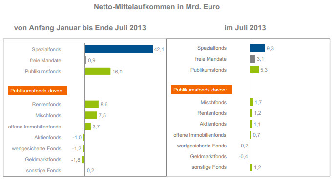 Heute veröffentlichte der Bundesverband Investment und Asset Management e.V. (BVI) die aktuellen Zahlen für Deutschland. In Investmentfonds und freie Mandate wurden im Juli 17,7 Milliarden Euro angelegt. Damit stiegen die Nettozuflüsse seit Jahresbeginn auf 59 Milliarden Euro. Deutscher Spitzenreiter waren Spezialfonds mit 9,3 Milliarden Euro. Deren Zuflüsse übertreffen mit insgesamt 42,1 Milliarden Euro im laufenden Jahr den Wert des Vorjahres von 36,7 Milliarden Euro. Publikumsfonds gewannen 5,3 Milliarden Euro. Anders als global und europaweit sind hierzulande nicht die Aktienfonds am stärksten gefragt. Mischfonds machen unter den Publikumsprodukten mit 1,7 Milliarden Euro den größten Anteil aus, gefolgt von Rentenfonds mit 1,2 Milliarden Euro. Aktienfonds erzielten Zuflüsse in Höhe von 1,1 Milliarden Euro und verzeichneten damit erstmals seit vier Monaten keine Abflüsse mehr.