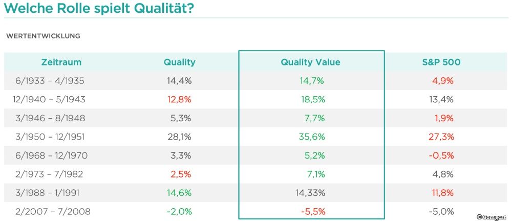 Dass eine Fokussierung auf Qualität sich gerade in Zeiten höherer Inflation auszahle, sei kein Zufall, erklärt der Aktien-Experte. Value oder Growth spiele bei der Wahl der Strategie zunächst eine eher untergeordnete Rolle. Ein flüchtiger Blick in die Historie gebe schließlich noch keinen Aufschluss darüber, ob sich grundsätzlich Value- oder Growth-Aktien besser entwickelten, wenn die Verbraucherpreise steigen. Doch bei näherer Betrachtung zeige sich folgendes: Im Vergleich zur Entwicklung des S&P 500 und auch zu Strategien, die ausschließlich auf Qualität, aber nicht explizit auf Value setzten, war eine Qualititäts-Strategie in Inflationsszenarien fast immer eine gute Wahl.