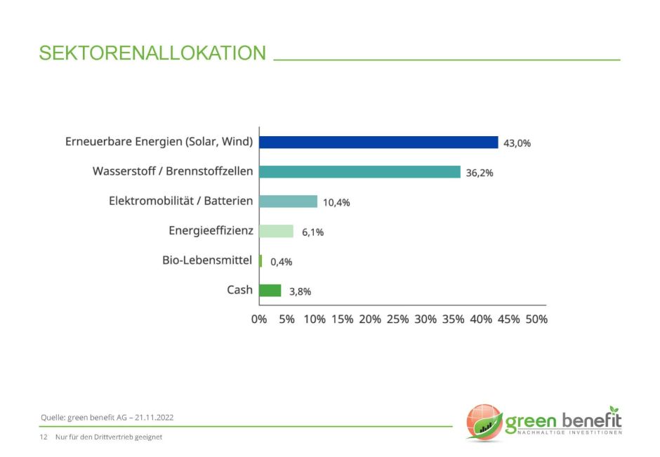 Diesen Wachstumsschub machen sich Lehman und seine Fondsberaterkollegen von green benefit zu Nutze. Getreu dem Motto "Die Welt verbessern und damit Geld verdienen" investieren sie ausschließlich in Werte, die ihren hohen ökologischen, ethischen und sozialen Ansprüchen genügen. Soll heißen: Der Fonds übt seine Stimmrechte auch auf Hauptversammlungen aus und informiert über sein Stimmverhalten. Komplett ausgeschlossen sind Gentechnik in der Landwirtschaft, fossile Brennstoffe, Atomenergie, Waffen und Rüstungsgüter, Glücksspiel, Spirituosen, Tabakwaren, und ausbeuterische Kinderarbeit. „Wir nehmen nur ‚pure player‘, wie beim deutschen Reinheitsgebot fürs Bierbrauen“, betont Lehmann. Pure Play bedeute, dass ein Unternehmen auf eine Sparte oder ein Produkt wie Wasserstoff oder Solar fokussiert sei. Mischkonzerne würden nicht berücksichtigt. So sei das Portfolio reiner und einfacher in der Beurteilung von Nachhaltigkeitskriterien. Titel aus den Sektoren Erneuerbare Energien, insbesondere Solarunternehmen, machen aktuell 43 Prozent des Fonds aus, Werte aus dem Wasserstoff- und Brennstoffzellensektor sind mit 36 Prozent gewichtet.