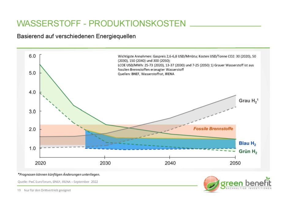 Sehr optimistisch zeigte sich Lehman auf der Veranstaltung nicht nur für die künftige Performance von Unternehmen, die im Solar- und Energiebereich tätig sind, sondern auch für diejenigen Firmen, die in der Wasserstoff- und Brennstoffzellentechnikbranche agieren. Dies sei ein Sektor, der in den kommenden Jahren kräftig wachsen werde, da es immer mehr Anwendungsbereiche vor allem im Transportwesen gebe und die Herstellungskosten zudem deutlich sinken, so Lehmann. Insgesamt würde es weltweit 359 Wasserstoff-Projekte und Investitionen von rund 500 Milliarden US-Dollar bis 2030 geben. Darunter sind Giga-Projekte zur Wasserstoffherstellung, Groß-Projekte mit industrieller Wasserstoff-Nutzung, Projekte aus dem Transportwesen, Wirtschaftsprojekte mit integrierter Wasserstofftechnologie und Infrastrukturprojekte. Studien zu Folge könnte allein der globale Markt für grünen Wasserstoff von 2,1 Milliarden US-Dollar im Jahr 2021 auf knapp 136 Milliarden US-Dollar im Jahr 2031 klettern. Dies entspräche einer durchschnittlichen Wachstumsrate von 51,6 Prozent im Jahr.