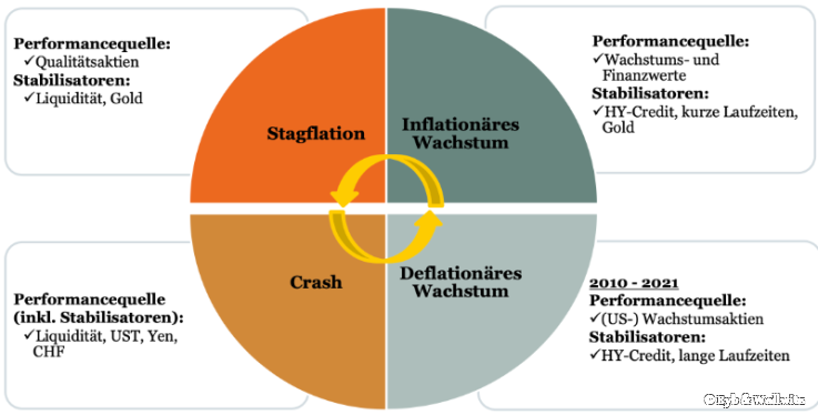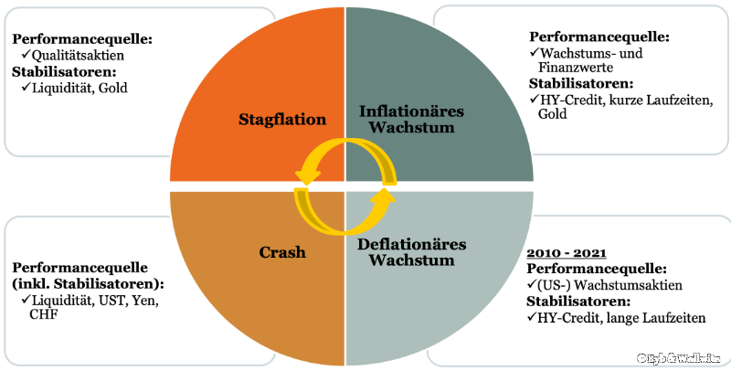 Um die Aktienstrategie innerhalb der Fonds passend zur Konjunkturerwartung ausrichten zu können, nutzt das Fondsmanagement bei Eyb & Wallwitz eine Art Konjunkturphasen-Uhr. Es gibt darauf vier Phasen, von deflationärem über inflationäres Wachstum, hin zur Stagflation und zum Crash. „Die Nachfrage nach Unternehmen, die von sich aus wachsen, war lange Zeit hoch. Zuletzt sahen wir mehr Wachstum und Inflation. Diese Phase haben wir durch den Krieg in der Ukraine und seine Folgen aber leider sehr schnell verlassen. Jetzt steuern wir auf eine Stagflations-Phase zu. Das ist für Kapitalmärkte eine unangenehme Situation“, erklärt Andreas Fitzner.