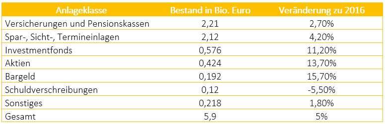 Weitere sieben Prozent liegen aktuell in Aktienvermögen. Es wuchs gegenüber dem Vorjahr um 13,7 %. Private Haushalte besitzen nun Aktien im Wert von insgesamt 424 Mrd. Euro statt 374 Mrd. Euro (Stand 2016).