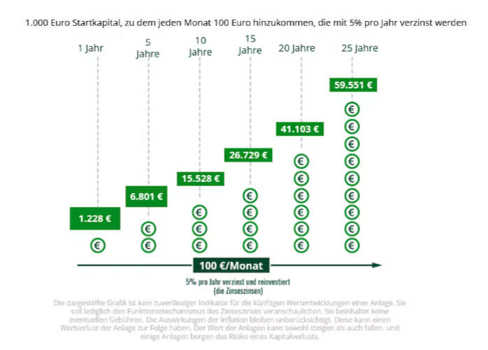 Wenn man jeden Monat denselben Betrag anlegt, reduziert sich zudem der Sparaufwand. Daher kann man gar nicht früh genug anfangen. Je früher Sie anfangen zu sparen, desto mehr kann Ihr Kapital wachsen. Im Laufe der Zeit kommen Zinsen zum Anfangskapital hinzu. Diese Zinsen bringen ihrerseits wieder Zinsen. Das ist das Schöne am Zinseszins.
