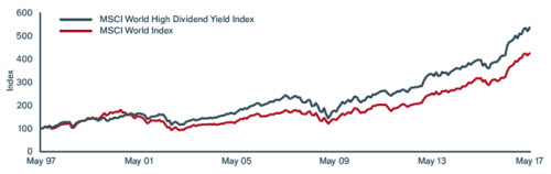 Source: Thomson Reuters Datastream, 31 May 1997 to 31 May 2017, total return indices, in sterling terms, rebased to 100. Past performance is not a guide to future performance. Yields may vary and are not guaranteed.