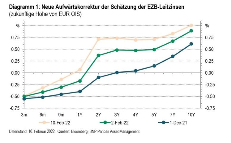 Die meisten Marktbeobachter gingen davon aus, dass es sich bei der EZB-Sitzung am 3. Februar um eine weitere unspektakuläre Zusammenkunft handeln würde, wie wir sie in der jüngsten Zeit öfter erlebt haben. Aber wider Erwarten absolvierte die Zentralbank eine Kehrtwende hin zu einer aggressiveren Haltung. Daher stieg der vom Markt in einem Jahr erwartete Einlagenzins; während des nächsten Jahres wird jetzt mit einem Anstieg um mehr als 50 Bp gerechnet. Das wären mehr als dreimal soviel wie die 15 Bp, von denen noch vor zwei Monaten die Rede war.