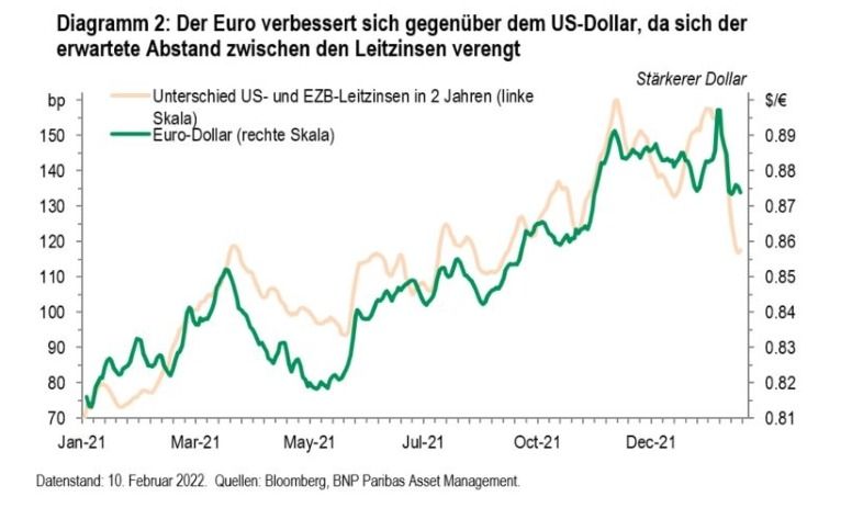 Die Abwertung des Euro seit Anfang 2021 war teilweise auf die Erwartung zurückzuführen, dass die Leitzinsen in den USA stärker steigen würden als in der Eurozone. Die weitere Entwicklung des Euros wird wahrscheinlich auch in Zukunft eher von der Entwicklung der Erwartungen als vom tatsächlichen Renditeabstand abhängen.