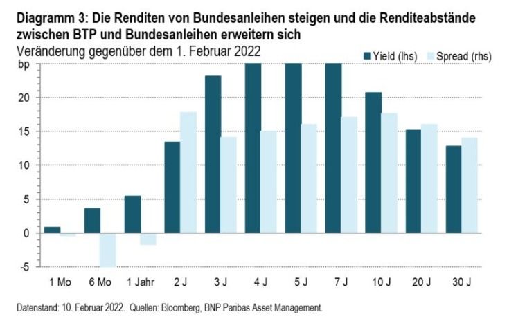 Die Zinsen der Staatsanleihen erhöhten sich entsprechend. So stiegen die Zinsen zehnjähriger Bundesanleihen beispielsweise um 25 Bp und gelangten vom negativen in den positiven Bereich.