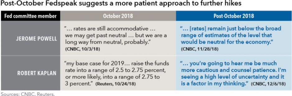 The Fed hiked rates to its new target range by 25 basis points, as expected. However, the Fed’s stance on future hikes has moderated amid tighter financial conditions.A pause in 2019 now appears more likely.