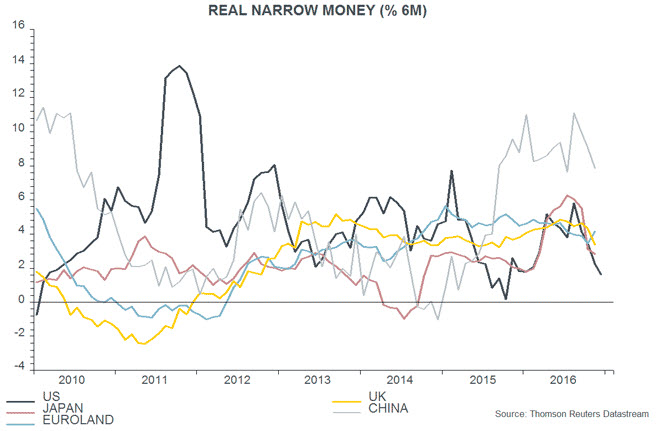 A counter-argument to the slowdown view is that US-led fiscal stimulus will act to boost global growth in the second half of 2017 and 2018. The effects of fiscal policy, however, should be incorporated in narrow money trends: shifts in money demand are largely driven by changes in spending intentions of households and firms, which would strengthen in response to an effective fiscal stimulus. If the counter-argument is correct, that is, real money growth should rebound in early 2017. Even if it does, the recent pull-back suggests a softer patch for the economy over the summer.