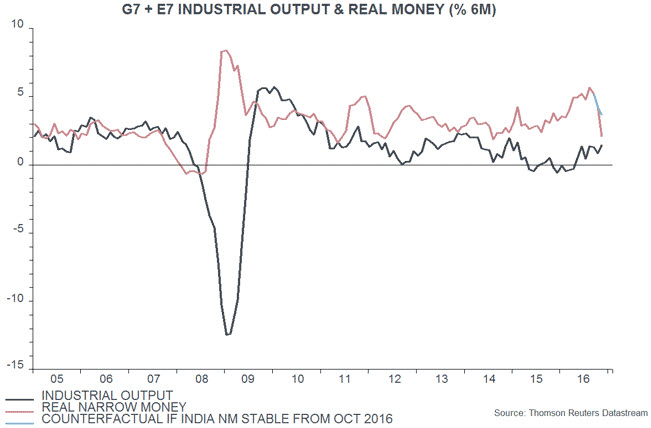 Our base-case scenario, therefore, is that the global economy will remain strong in early 2017 but will begin to lose momentum in the late spring / early summer. This scenario would be confirmed by a peaking out of leading indicator growth in late 2016 / early 2017. The fall in real money growth to date – excluding the India effect – suggests a moderate economic slowdown rather than significant weakness.
