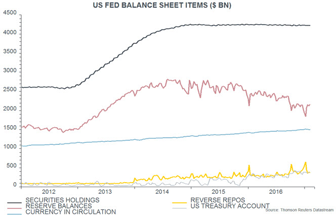 The fall in reserves does not reflect any reversal of QE: in line with its stated policy, the Fed has been reinvesting principal repayments and its securities portfolio has remained stable – third chart.