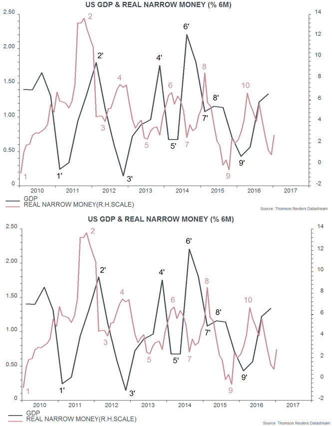 The first chart, reproduced from the earlier post, shows that turning points in six-month real narrow money growth have consistently led those in two-quarter GDP growth in recent years. The second chart shows a similar relationship with the inverted swap spread.