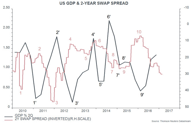 US narrow money trends suggest a moderation of economic growth in the spring / summer – see post from last week. The two-year swap spread has also led economic fluctuations historically and is giving a similar cautionary message.